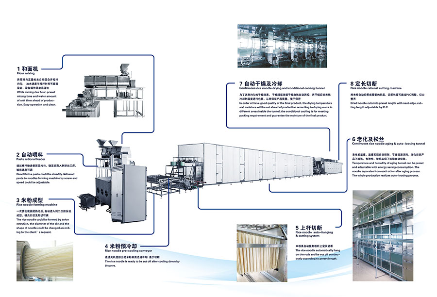 該生產(chǎn)線可用于生產(chǎn)江西米粉、桂林米粉等直條米粉用,產(chǎn)品直徑從1.0mm到1.6mm可調(diào),生產(chǎn)出的直條米粉質(zhì)地緊密、外形均勻、條型整齊、口感滑爽Q彈,可煮可炒。生產(chǎn)線設(shè)計科學(xué)、工藝合理、操作簡單、使用人工少、故障率低、自動化程度高,可實現(xiàn)生產(chǎn)過程標(biāo)準(zhǔn)化。除可生產(chǎn)普通米線外,本生產(chǎn)線還可用于紅米、黑米等其他復(fù)配原料的生產(chǎn),為廣大消費者提供更多的選擇。